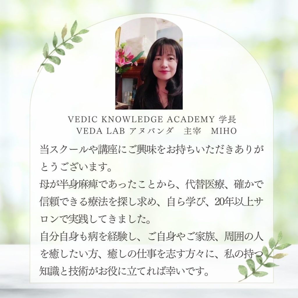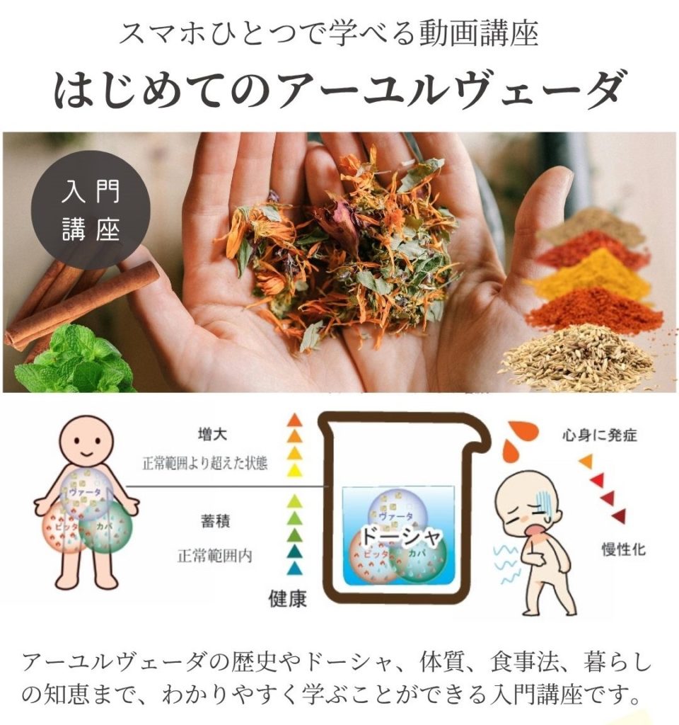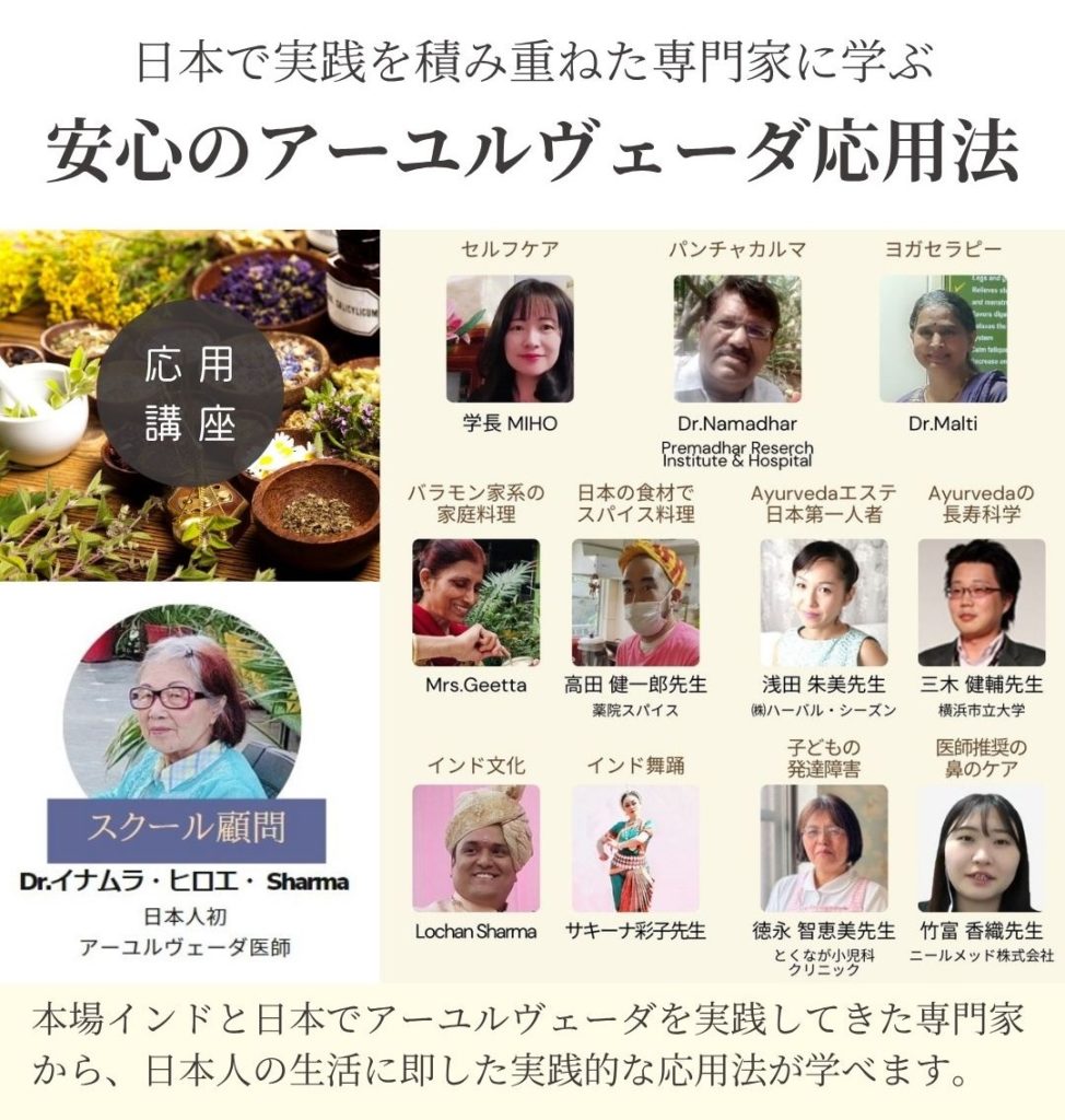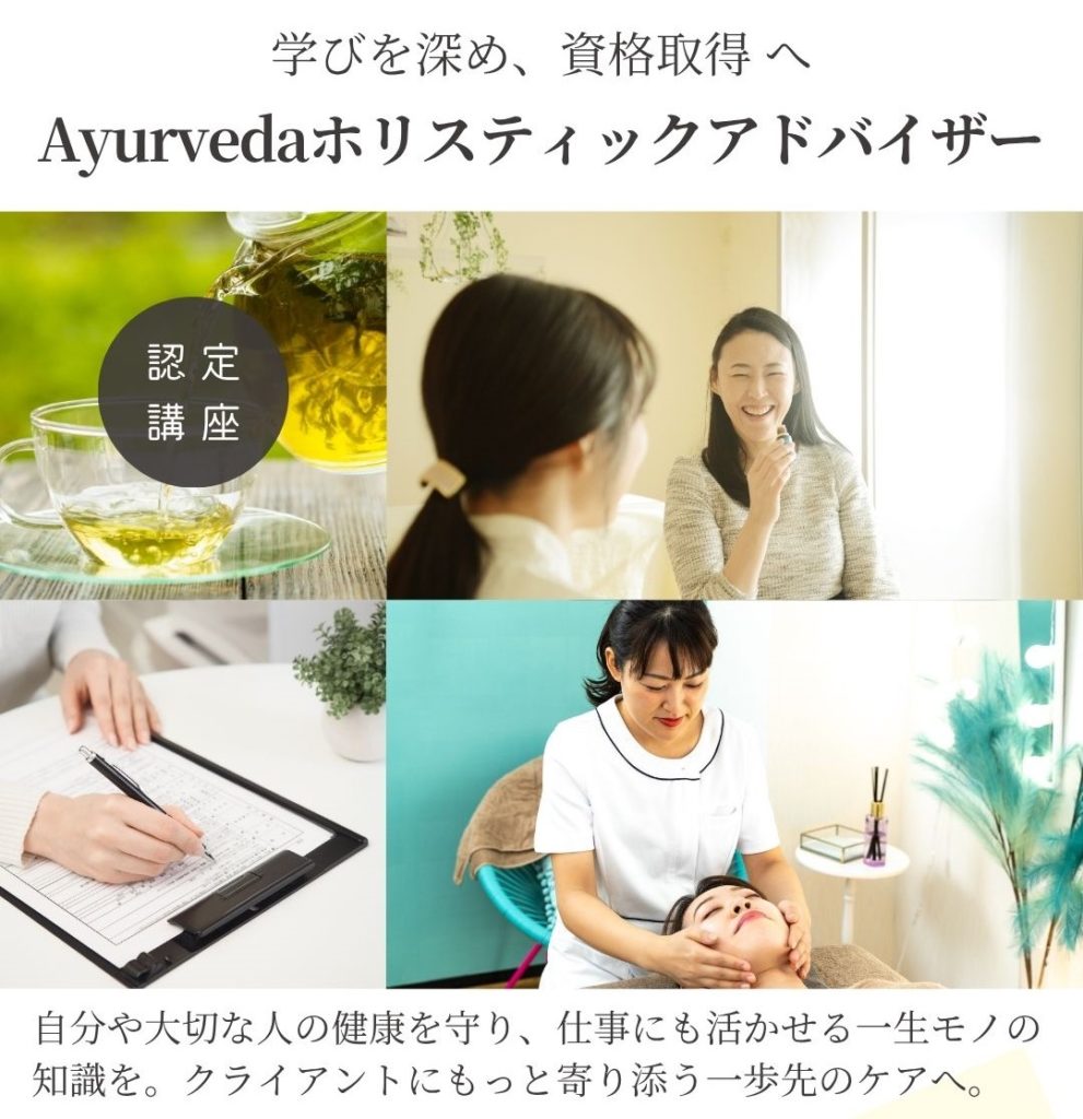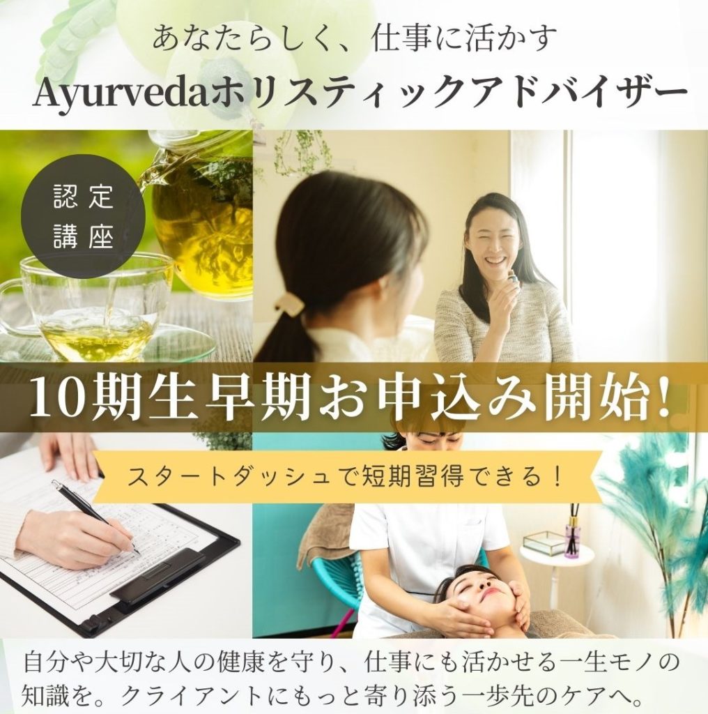 アーユルヴェーダ通信講座 初級講座 中級講座 上級講座 >>各講座詳細はこちら 短期集中講座 初級+中級+上級を一貫して学ぶ 4月・10月の年2回の開講 >>Ayurvedaホリスティックアドバイザー資格認定コース >>初級・中級・上級講座 >>アドバイザー資格認定コース