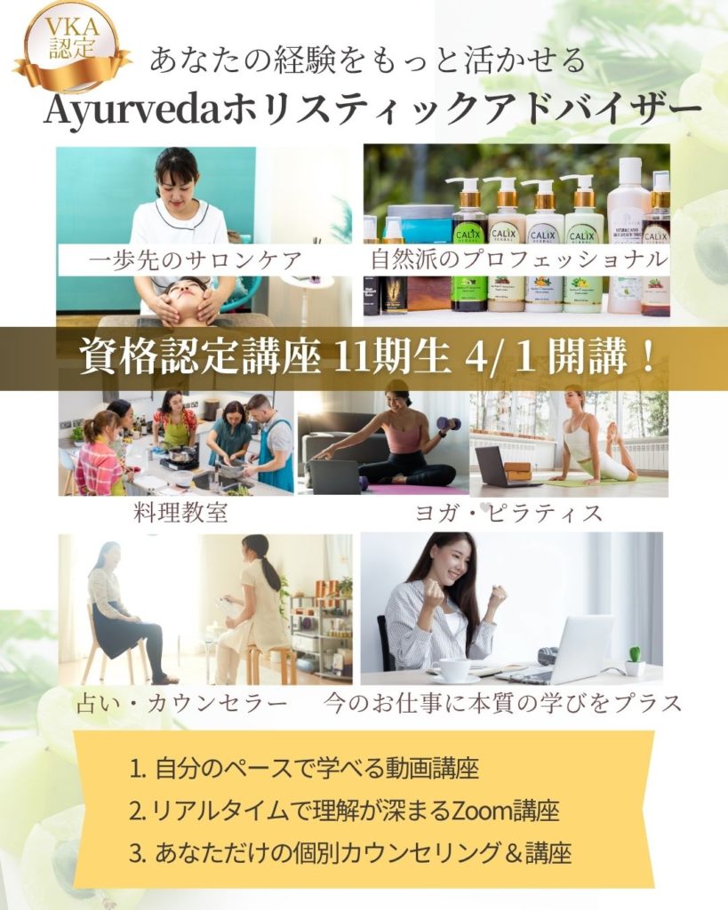 「Ayurvedaホリスティックアドバイザー資格認定コース」は、初級・中級・上級を、短期集中で一貫して学べる総合プログラムです。