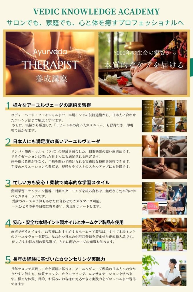 アーユルヴェーダセラピストに必要な技術と理論はもちろん、カウンセリング力、製品知識、そして心を込めたホスピタリティまで、現場で活かせるすべてを体系的に学べる講座です。