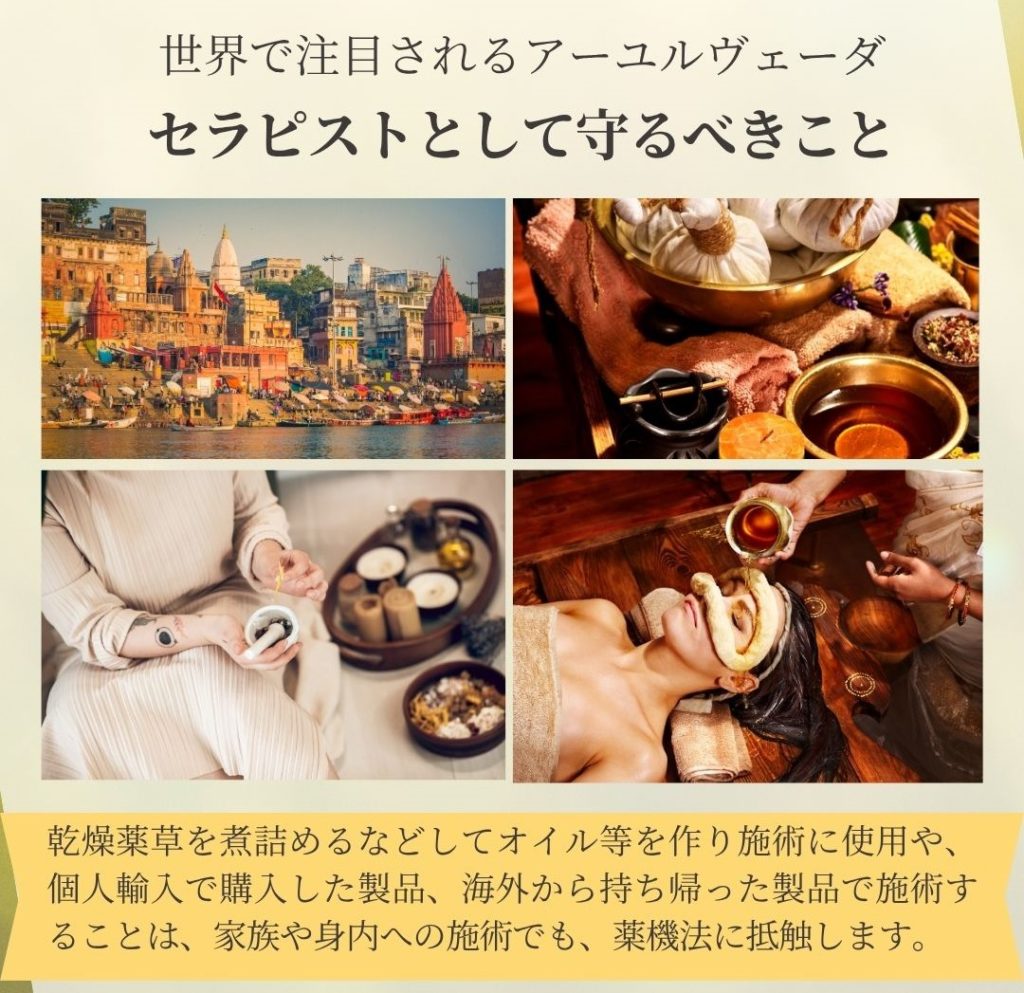 インドの施術をそのまま日本ですることは、日本の医師法・薬機法に抵触するものが多くあり、気候、日本人の体質・気質、ホスピタリティにおいて考慮すべきことが多くあります。