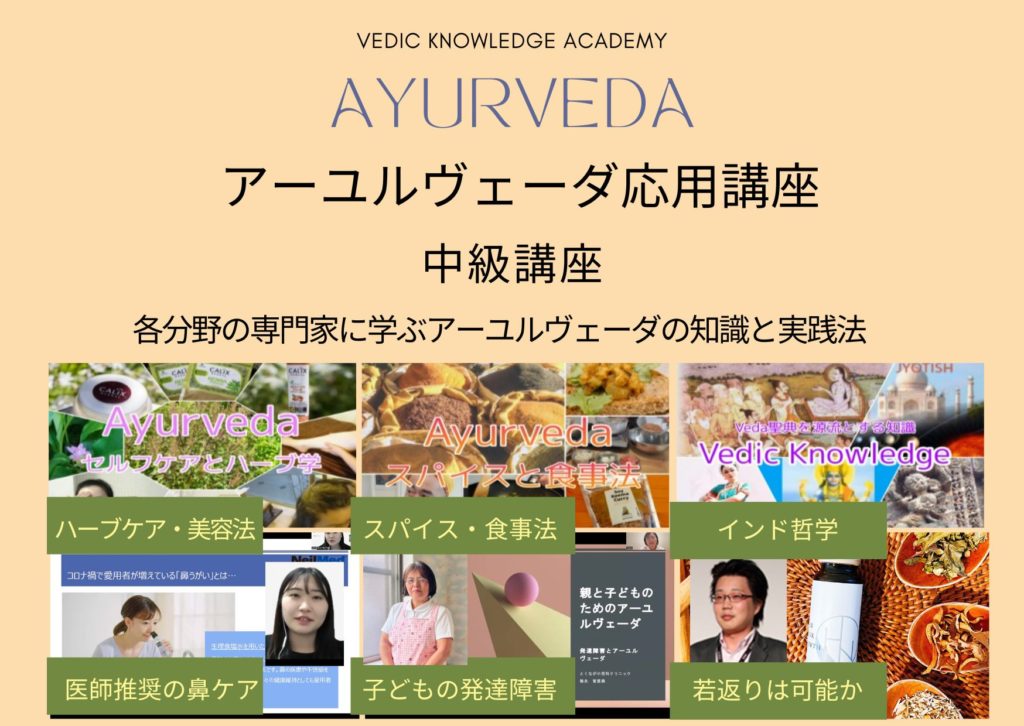 日本で安心して使える製品知識と活用法、より多くのセルフケアや実生活に無理なく取り入れられるアーユルヴェーダの応用法など、日々の暮らしの中で実践を深めることができる内容です。